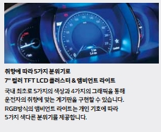 고급형 클러스터(7"/컬러 TFT LCD/디스플레이 가변형),앰비언트 라이트,다이아몬드 패턴그레인, 알루미늄 키킹 플레이트 편의 :